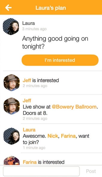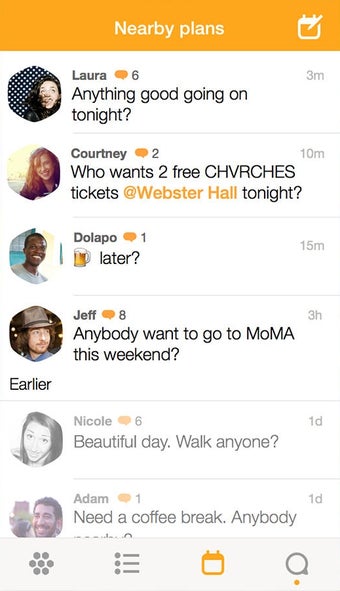 O app Swarm tem uma navegação bem simples. Os menus são convenientemente acessíveis por meio de abas e permitem checar quem está na vizinhança, uma linha do tempo dos lugares frequentados por seus amigos recentemente, notificações e a seção Criar um Plano. Este último menu deixa você definir um lugar, explicar qual é o seu plano e, então, compartilhá-lo com quiser quem quiser convidar.